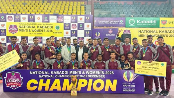 আলী আহসান রবি : ঢাকা, ০৩ জানুয়ারি ২০২৬ (শনিবার): বর্ডার গার্ড বাংলাদেশ (বিজিবি) ‘জাতীয় কাবাডি ২০২৫’-এর পুরুষ বিভাগে চ্যাম্পিয়ন হওয়ার গৌরব অর্জন করেছে। আজ বিকেলে ঢাকার পল্টনে শহীদ এম. মনসুর