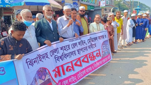 তারেক মাহমুদ জয়, ঝিনাইদহ প্রতিনিধি-: ঝিনাইদহ জেলা শহরে রেল লাইন, মেডিকেল কলেজ ও কৃষি বিশ্ববিদ্যালয় স্থাপনের দাবীতে মানববন্ধন কর্মসূচী পালিত হয়েছে। শনিবার সকালে শহরের পায়রা চত্বরে এ কর্মসূচীর আয়োজন করে