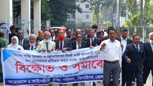 তারেক মাহমুদ জয়, ঝিনাইদহ প্রতিনিধি-: সারাদেশে চলমান নৈরাজ্য ও অস্থিতিশীলতার প্রতিবাদে ঝিনাইদহে বিক্ষোভ সমাবেশ করেছেন আইনজীবীরা। বুধবার সকাল সাড়ে ১০টায় জেলা আইনজীবী সমিতির কার্যালয়ের সামনে এ বিক্ষোভ সমাবেশ অনুষ্ঠিত হয়।