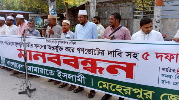 সাদ আহাম্মদ, মেহেরপুর জেলা প্রতিনিধি : পিআর পদ্ধতিতে নির্বাচন ও জুলাই সনদ বাস্তবায়ন সহ ৫ দফা বাস্তবায়নের দাবীতে বাংলাদেশ জামায়াতে ইসলামী মেহেরপুর জেলা শাখার আয়োজনে বুধবার বেলা তিনটার দিকে মেহেরপুর
