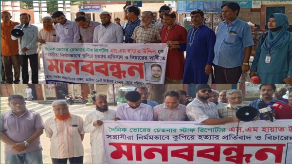 মোঃ ফারুক আহাম্মেদ, স্টাফ রিপোর্টার: ব্রাহ্মণবাড়িয়ার সরাইলে বাগেরহাটের সাংবাদিক এস,এম হায়াত উদ্দিন হত্যার প্রতিবাদে মানববন্ধন করেছেন সরাইল উপজেলার সকল সাংবাদিক বৃন্দ। শনিবার সকাল ১১ টায় উপজেলা শহিদ মিনার সংলগ্ন সড়কে