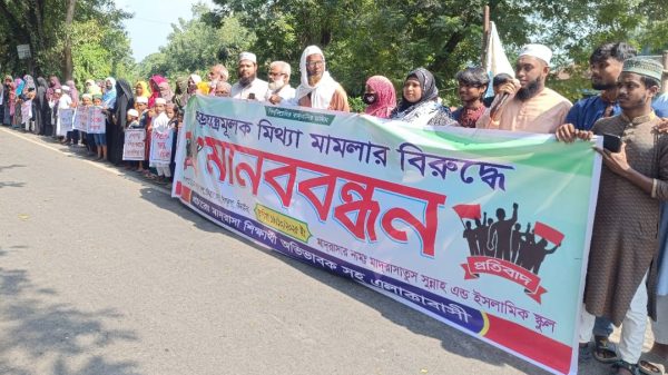 মোঃ আমোদ আলী, শৈলকুপা, ঝিনাইদহ : ঝিনাইদহের শৈলকুপায় দুই শিক্ষকের বিরুদ্ধে দায়ের হওয়া মামলা প্রত্যাহার ও বন্ধ মাদ্রাসা খুলে দেওয়ার দাবিতে মানববন্ধন ও বিক্ষোভ করেছে শিক্ষার্থী, অভিভাবকসহ এলাকাবাসী। রোববার (১৯