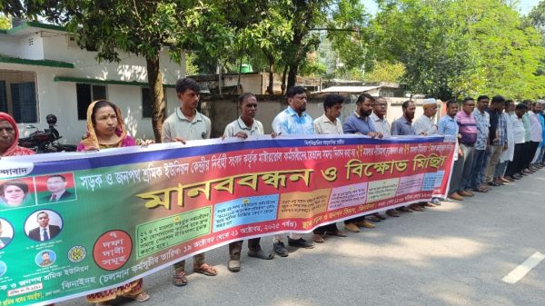 তারেক মাহমুদ জয়, ঝিনাইদহ প্রতিনিধি: ৭ দফা দাবির বাস্তবায়নের দাবিতে ঝিনাইদহে মানববন্ধন ও বিক্ষোভ করেছে সড়ক ও জনপথ (সওজ) বিভাগের কর্মচারীরা। সোমবার সকালে জেলা সওজ কার্যালয়ের সামনে শ্রমিক ইউনিয়নের কেন্দ্রীয়