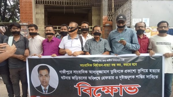 মোঃ রবিউল ইসলাম, ভ্রাম্যমান প্রতিনিধিঃ গাজীপুরে সাংবাদিক তুহিন হত্যাসহ সারাদেশে সাংবাদিক নিপীড়ণের প্রতিবাদ ও বিচারের দাবিতে ঝিনাইদহে মুখে কালো কাপড় বেঁধে মানববন্ধন ও মৌন মিছিল হয়েছে। রোববার সকালে শহরের পোস্ট
