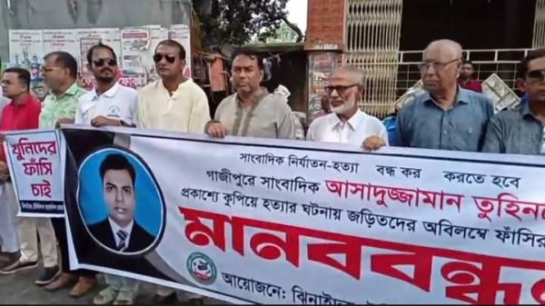 মোঃ রবিউল ইসলাম, ভ্রাম্যমাণ প্রতিনিধিঃ গাজীপুরে সাংবাদিক আসাদুজ্জামান তুহিনকে কুপিয়ে হত্যায় জড়িতদের ফাঁসির দাবিতে ঝিনাইদহে মানববন্ধন করেছেন টেলিভিশন সাংবাদিক ফোরামের সদস্যরা। সোমবার (১১ আগস্ট) বেলা ১১টায় শহরের পোস্ট অফিস মোড়ে