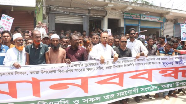 এম রোমানিয়া খুলনা : ১১/০৮/২০২৫ খুলনা কয়রা উপজেলার উদ্দোগে সাধারণ সম্পাদক নুরুল আমিন বাবুলের বহিষ্কারাদেশ প্রত্যাহারের দাবিতে সাত ইউনিয়েনের সর্বস্তরের জনগনের উপস্থিতিতে মানববন্ধন পালিত হয়। জাতীয়তাবাদী ওলামা দলের মাওলানা গোলাম