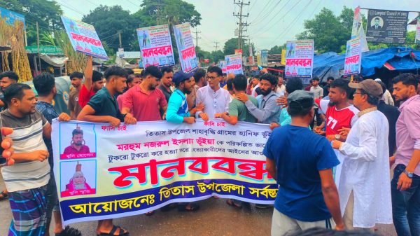 কুমিল্লা প্রতিনিধিঃ মোঃ রমিজ উদ্দিন : কুমিল্লার তিতাসে নিহত নজরুল ইসলাম ভূইয়ার হত্যাকারীদের ফাঁসির দাবিতে মানববন্ধন ও বিক্ষোভ সমাবেশ অনুষ্ঠিত হয়েছে। গতকাল বুধবার সকাল সাড়ে ১০টায় সর্বস্তরের জনগণের আয়োজনে সহস্রাধিক