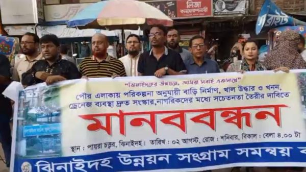 মোঃ রবিউল ইসলাম, ঝিনাইদহ প্রতিনিধি: পৌর এলাকায় পরিকল্পনা অনুযায়ী বাড়িঘর নির্মাণ, খাল খনন ও উদ্ধার, দ্রুত ড্রেনেজ ব্যাবস্থার উন্নয়নসহ পৌরসভার নাগরিকদের সচেতনতা বৃদ্ধির লক্ষে প্রচার প্রচারণার দাবিতে ঝিনাইদহে মানববন্ধন কর্মসূচি