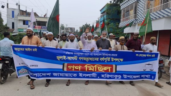 মোঃ রবিউল ইসলাম, ঝিনাইদহ জেলা প্রতিনিধিঃ ঝিনাইদহের হরিণাকুণ্ডু উপজেলায় বাংলাদেশ জামায়াতে ইসলামী “জুলাই অভ্যুত্থান দিবস” উপলক্ষে র্যালি ও গণ মিছিলের আয়োজন করেছেন। মঙ্গলবার বিকাল ৩ টায় “জুলাই অভ্যুত্থানের বর্ষপূর্তি উপলক্ষে