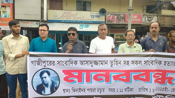 আল-হুদা মালী, স্টাফ রিপোর্টার: গাজীপুরে সাংবাদিক আসাদুজ্জামান তুহিনকে নৃশংসভাবে কুপিয়ে হত্যার প্রতিবাদ ও হত্যাকারীদের অবিলম্বে গ্রেফতার করে আইনের আওতায় এনে বিচারের দাবিতে মানববন্ধন অনুষ্ঠিত হয়েছে। শনিবার (৯ আগস্ট) সকাল ১০টায়