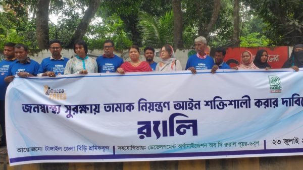 টাঙ্গাইল প্রতিনিধি : জনস্বাস্থ্য সুরক্ষায় তামাক নিয়ন্ত্রণ আইন শক্তিশালী করার দাবিতে টাঙ্গাইলে মানববন্ধন অনুষ্ঠিত হয়েছে। বুধবার (২৩ জুলাই) সকালে টাঙ্গাইল প্রেসক্লাবের সামনে ডেভেলপমেন্ট অর্গানাইজেশন অব দ্য রুরাল পুওর (ডরপ) এর