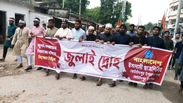 মোঃ লিটন হোসেন, ঝিনাইদহ জেলা প্রতিনিধিঃ ঝিনাইদহের কোটচাঁদপুর জুলাই গণহত্যার বিচারের দাবীতে বিক্ষোভ মিছিল ও সমাবেশ অনুষ্ঠিত হয়েছে। রবিবার (২৭ জুলাই) বিকেলে বাংলাদেশ ইসলামী ছাত্রশিবিরের উদ্যোগে ওই বিক্ষোভ মিছিল ও