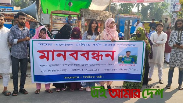 নিজস্ব প্রতিনিধি : বিবাহের প্রলোভন দেখিয়ে ধর্ষণ করার প্রতিবাদে মানববন্ধন করেছে ছাত্র ও যুবসমাজ এবং সাধারণ মানুষ ১৪ মার্চ ২০২৫ শুক্রবার বেলা ৩ টায় খুলনার প্রাণকেন্দ্র শিববাড়ি মোরস্ত সুমাইয়া জান্নাতি