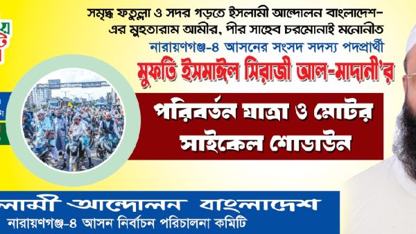 নারায়ণগঞ্জ–৪ আসনে ইসলামী আন্দোলনের শক্তিশালী শোডাউন: পরিবর্তন যাত্রা ও মোটরসাইকেল শোভাযাত্রায় জনসমর্থনের জোয়া নিজস্ব প্রতিবেদকঃ নারায়ণগঞ্জ–৪ আসনে ইসলামী আন্দোলন বাংলাদেশ-এর নির্বাচনী প্রচারণা প্রতিদিনই নতুন উদ্দীপনা তৈরি করছে। আগামীকাল ০৭/১১/২০২৫ শুক্রবার