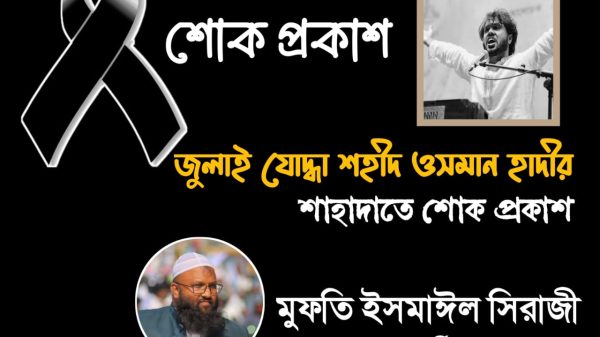 আলী আহসান রবি : শুক্রবার, ১৯ ডিসেম্বর, ২০২৫ জুলাই গণঅভ্যুত্থানের সম্মুখসারির অকুতোভয় যোদ্ধা ও ‘ইনকিলাব মঞ্চ’-এর মুখপাত্র শরিফ ওসমান হাদির অকাল প্রয়াণ দেশ ও জাতির জন্য এক অপূরণীয় ক্ষতি। এ