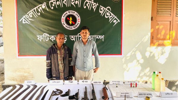 আলী আহসান রবি : ২৭ জানুয়ারি, ২০২৬ চট্টগ্রামের ফটিকছড়ি উপজেলায় বাংলাদেশ সেনাবাহিনীর বিশেষ অভিযানে অস্ত্র ও দেশীয় মদসহ দুই সশস্ত্র সন্ত্রাসীকে আটক করা হয়েছে। গোয়েন্দা তথ্যের ভিত্তিতে মঙ্গলবার (২৭ জানুয়ারি