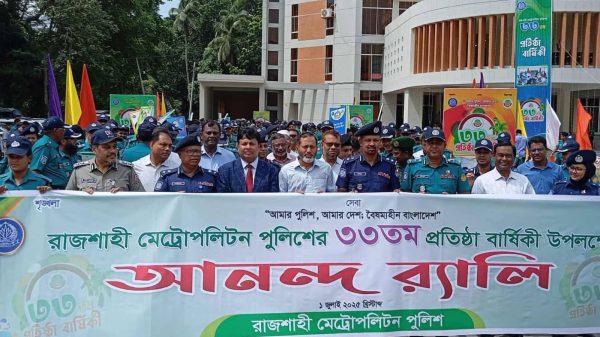 আবুল হাশেম, স্টাফ রিপোর্টারঃ রাজশাহী মেট্রোপলিটন পুলিশ (আরএমপি) ৩৩তম প্রতিষ্ঠাবার্ষিকী উদযাপন উপলক্ষে আনান্দ র্যালি করা হয়েছে। মঙ্গলবার (১ জুলাই) সকালে বর্ণাঢ্য আয়োজনের মধ্য দিয়ে আরএমপি সদর দপ্তরে পুলিশ কমিশনার মোহাম্মদ