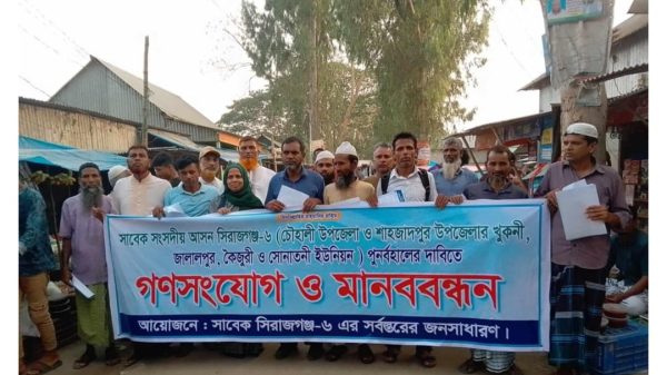 চৌহালী প্রতিনিধি, আব্দুল আলিম : চৌহালী (সিরাজগঞ্জ) প্রতিনিধি: সিরাজগঞ্জ-৬ (চৌহালী-শাহজাদপুর) সংসদীয় আসন পুনর্বহালের দাবিতে সিরাজগঞ্জের চৌহালীতে মানববন্ধন কর্মসূচি পালন করেছে বিএনপিসহ স্থানীয় নানা শ্রেণি পেশার মানুষ। শনিবার বিকেল সাড়ে ৫টায়