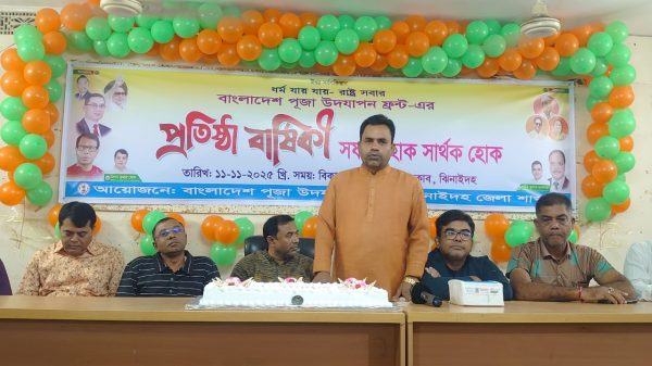 তারেক মাহমুদ জয়, ঝিনাইদহ প্রতিনিধি : বাংলাদেশ পূজা উদযাপন ফ্রন্ট এর ঝিনাইদহ জেলা শাখার প্রতিষ্ঠা বার্ষিকী পালিত হয়েছে। মঙ্গলবার সন্ধ্যায় ফ্রন্টের প্রথম প্রতিষ্ঠাবার্ষিকী উপলক্ষ্যে আলোচনা সভা ও কেক কাটা হয়।