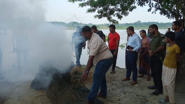 এস এম মনিরুজ্জামান : বাগেরহাট জেলা প্রতিনিধি: বাগেরহাটের মোল্লাহাটে উপজেলা প্রশাসন ও সিনিয়র উপজেলা মৎস্য কর্মকর্তার কার্যালয়ের যৌথ অভিযানে বিপুল পরিমাণ নিষিদ্ধ চায়না দুয়ারী জাল জব্দ করে আগুনে পুড়িয়ে ধ্বংস