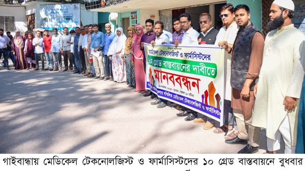 নিজস্ব প্রতিবেদক : গাইবান্ধায় মেডিকেল টেকনোলজিস্ট ও ফার্মাসিস্টরা দাবি পূরণে কর্তৃপক্ষকে ৭ দিনের আলটিমেটাম দিয়েছে। অন্যথায় বৃহত্তর আন্দোলনে নামার হুশিয়ারি দেয়া হয়েছে। আজ বুধবার (১৯ নভেম্বর) সকালে জেনারেল হাসপাতাল চত্বরে