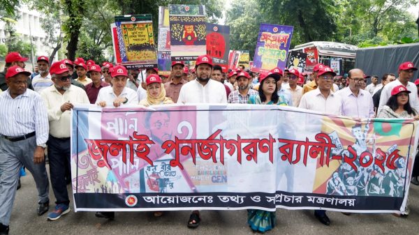আলী আহসান রবি : ঢাকা, ২রা আগস্ট ২০২৫ : জুলাই গণঅভ্যুত্থানের বর্ষপূর্তি উপলক্ষ্যে তথ্য ও সম্প্রচার মন্ত্রণালয়ের উদ্যোগে শনিবার (২রা আগস্ট) সকালে একটি বর্ণাঢ্য র্যালি অনুষ্ঠিত হয়েছে। র্যালিটি ঢাকার ওসমানী