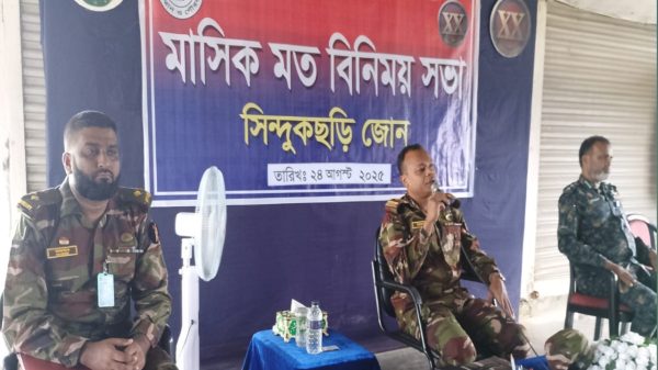 মোঃ সালাউদ্দিন:- বাংলাদেশ সেনাবাহিনীর খাগড়াছড়ির ২৪ আর্টিলারি ব্রিগেড গুইমারা রিজিয়নের ২০ফিল্ড রেজিমেন্ট আর্টিলারী সিন্দুকছড়ি জোনে মাসিক নিরাপত্তা ও মতবিনিময় সভার আয়োজন করা হয়েছে। রবিবার (২৪ আগস্ট ২০২৫) সিন্দুকছড়ি জোন