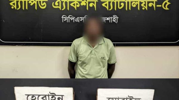 নিজস্ব প্রতিবেদকঃ রাজশাহীতে র্যাবের অভিযানে নতুন জুতার সেলাইকৃত সোলের ভিতরে অভিনব কায়দায় ১২০ গ্রাম হেরোইন পাচারকালে বিশু হেমরম নামে এক মাদক ব্যবসায়ীকে গ্রেফতার করা হয়েছে। গ্রেফতারকৃত ব্যক্তি হলেন, গোদাগাড়ী উপজেলার