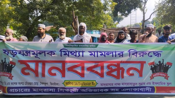 মোঃ আমোদ আলী, শৈলকুপা, ঝিনাইদহ : ঝিনাইদহের শৈলকুপায় দুই শিক্ষকের বিরুদ্ধে দায়ের হওয়া মামলা প্রত্যাহার ও বন্ধ মাদ্রাসা খুলে দেওয়ার দাবিতে মানববন্ধন ও বিক্ষোভ করেছে শিক্ষার্থী, অভিভাবকসহ এলাকাবাসী। রোববার (১৯