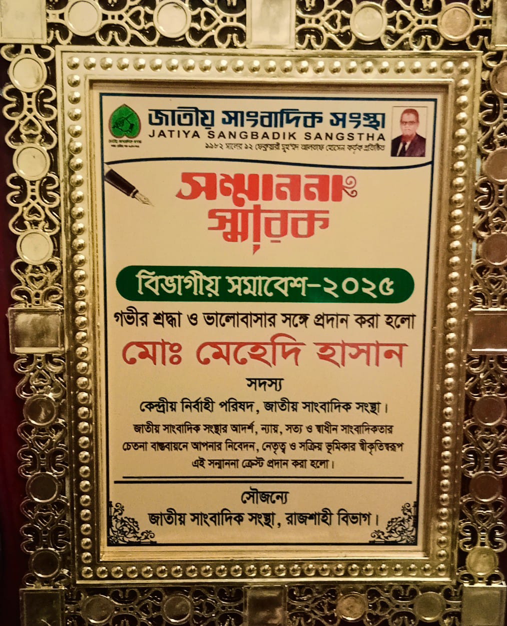 বিশেষ প্রতিনিধিঃ এই আমার দেশ পত্রিকার নোয়াখালী জেলা প্রতিনিধি “জাতীয় সাংবাদিক সংস্থার” কেন্দ্রীয় নির্বাহী পরিষদের সদস্য মেহেদী হাসানকে রাজশাহী বিভাগের জাতীয় সাংবাদিক সংস্থার বিভাগীয় অফিসে শুভেচ্ছা স্বরূপ ক্রেস্ট প্রদান করা হয়।