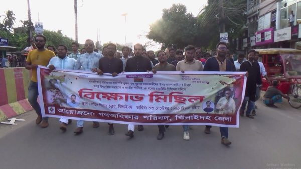 এদিকে জেলা গণ অধিকার পরিষদের ব্যানারে বিকেলে দলটির নেতা কর্মীরা ঝিনাইদহ শহীদ মিনার চত্বর থেকে একটি বিক্ষোভ র্যালী বের করে।র্যালীটি শহরের প্রধান প্রধান সড়ক ঘুরে পায়রা চত্তরে গিয়ে শেষ হয়। সেখানেই তারা সংক্ষিপ্ত সমাবেশ করে।